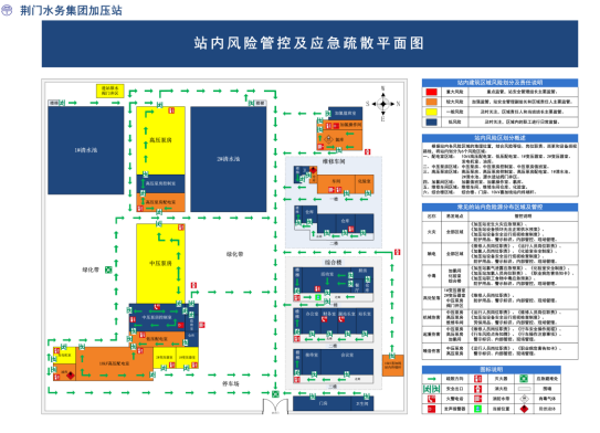 加壓站在站內(nèi)全面推行安全風險分級管控和隱患排查治理雙重預防機制,對作業(yè)現(xiàn)場可能存在的安全風險進行全面識別、評估和分級,同時制作風險四色圖和風險告知牌,將安全風險等級從高到低按區(qū)域依次劃分為重大、較大、一般和低風險,分別用紅、橙、黃、藍四種顏色標示,明確不同區(qū)域的風險等級、防范措施和相關責任人,以最直觀的方式展示作業(yè)現(xiàn)場的安全風險及防范措施。根據(jù)風險四色圖和風險告知牌外來人員能了解所處區(qū)域可能存在的風險,做好自身防護,施工人員則可以做好施工前的風險管控,降低作業(yè)過程中的安全風險。