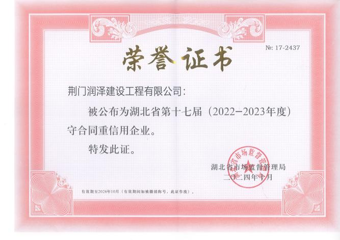 憑著“誠信為本、質(zhì)量為根”的堅(jiān)守,潤澤公司連續(xù)兩年獲評荊門市和湖北?。?022-2023年度)“守合同重信用企業(yè)”,市場競爭力和品牌影響力持續(xù)攀升。