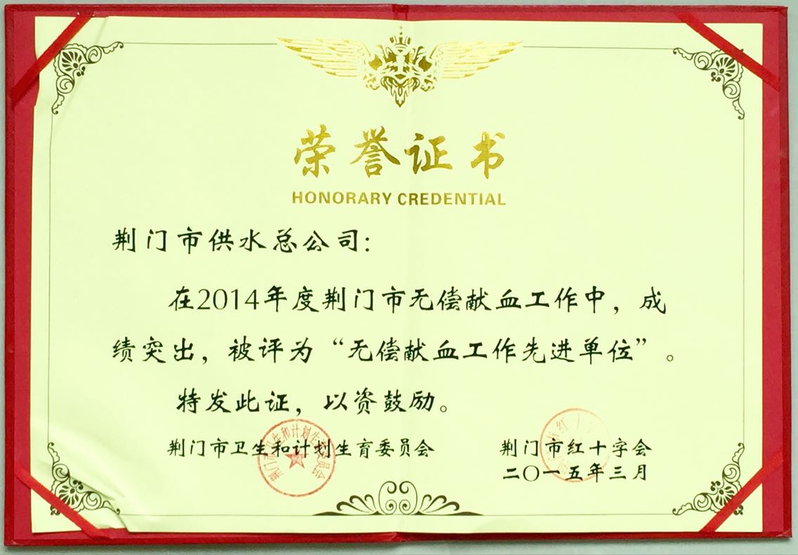 近日,市供水總公司先后被市文明辦、市工商局、市消協(xié)評(píng)為荊門市2013——2014年度“誠信經(jīng)營示范單位”;被市衛(wèi)計(jì)委、市紅十字會(huì)評(píng)為“2014年荊門市無償獻(xiàn)血工作先進(jìn)單位”。
