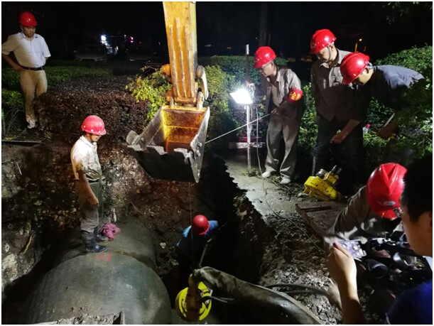 整個搶修工作安排在15日夜間11時至16日零晨6時進(jìn)行。由于爆管段位于掇刀區(qū)白石坡“白石”較多地段,機械開挖到一定程度后,施工基坑內(nèi)管道底部只能用人工進(jìn)行掏挖,一度給搶修工作造成極大困難。在搶修人員帶水作業(yè)頑強奮戰(zhàn)、不斷努力下,經(jīng)過18個小時的晝夜搶修,在16日零晨4點搶修完畢,按市供水總公司對社會服務(wù)承諾時間,于早上6時如期恢復(fù)供水。