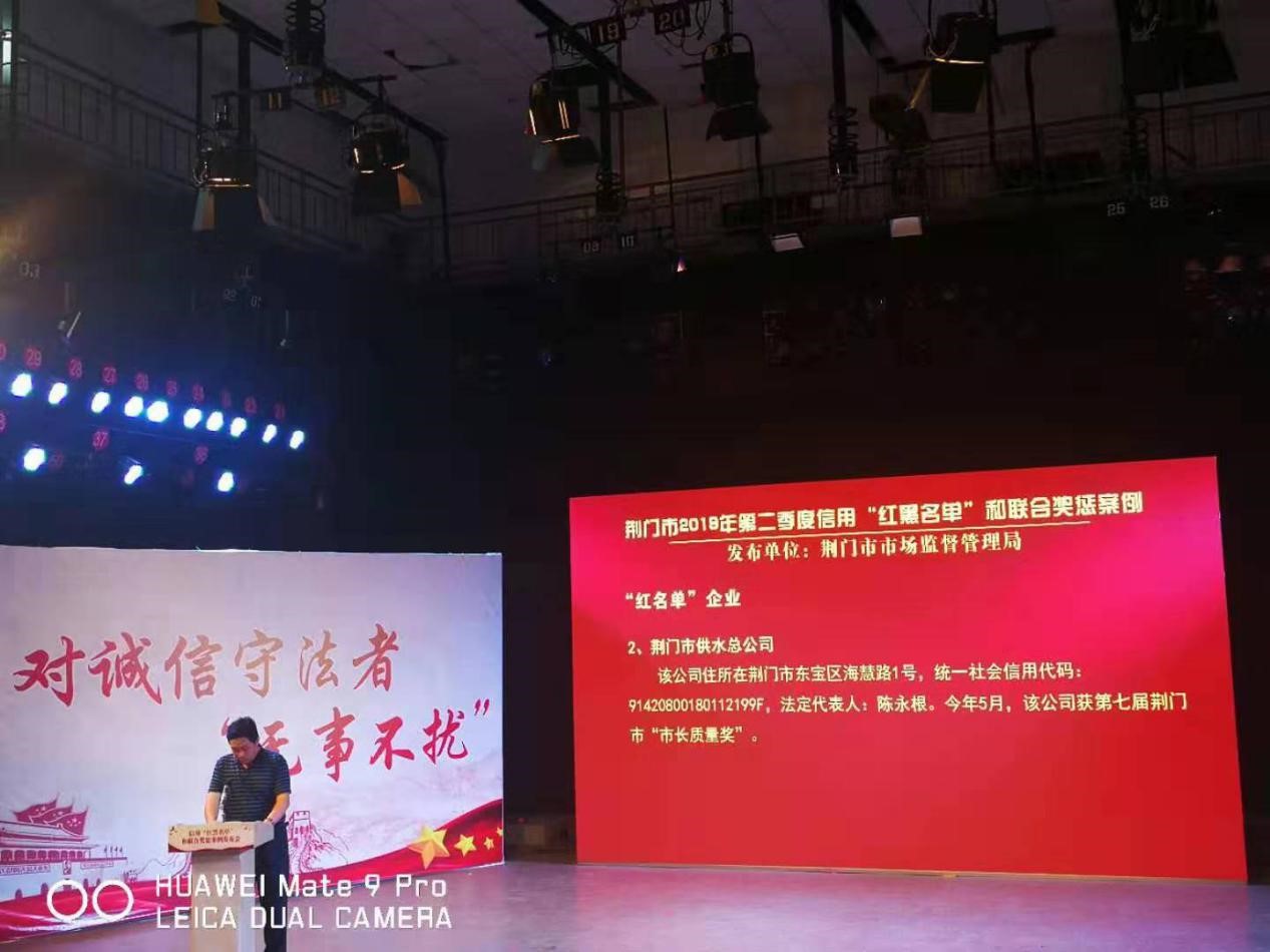 724日下午,荊門(mén)市社會(huì)信用體系建設(shè)領(lǐng)導(dǎo)小組辦公室、市發(fā)改委、人行荊門(mén)市中心支行聯(lián)合組織召開(kāi)第二季度信用“紅黑名單”和聯(lián)合獎(jiǎng)懲案例發(fā)布會(huì)。會(huì)上,市供水總公司被授予“全市市場(chǎng)監(jiān)管領(lǐng)域守信企業(yè)”榮譽(yù)稱(chēng)號(hào),入選荊門(mén)市守信企業(yè)“紅名單”。