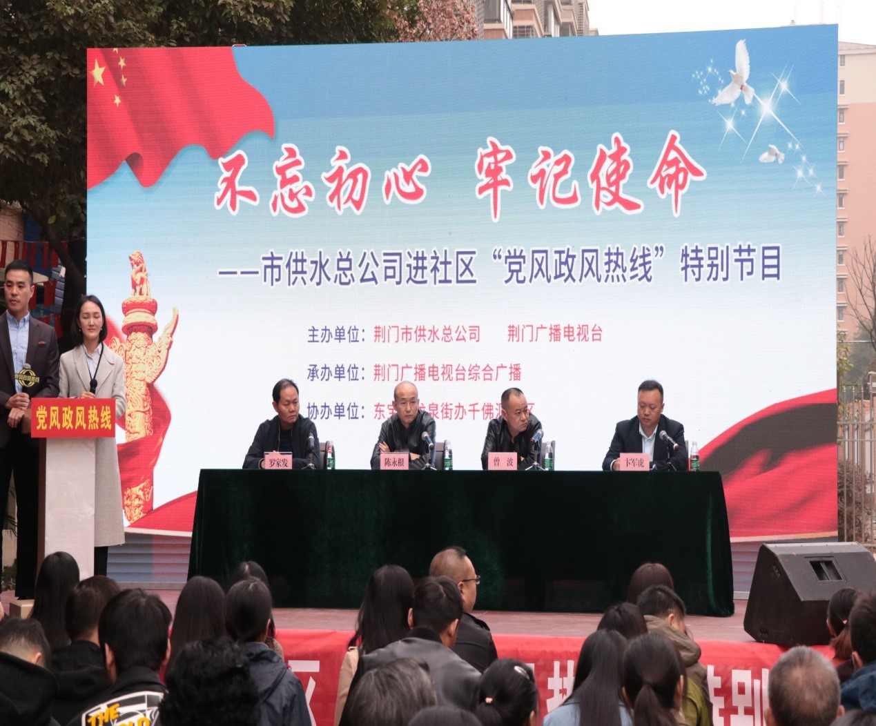 11月 6日上午,由荊門市供水總公司和荊門廣播電視臺聯(lián)合舉辦的“荊門供水進社區(qū)‘黨風(fēng)政風(fēng)熱線’特別節(jié)目”在荊門千佛洞社區(qū)舉行。市供水總公司黨委書記、總經(jīng)理陳永根帶領(lǐng)領(lǐng)導(dǎo)班子相關(guān)成員參加節(jié)目現(xiàn)場(網(wǎng)絡(luò))直播,圍繞“不忘初心、牢記使命”主題教育,傾聽民情民意,接受現(xiàn)場問政,回應(yīng)百姓訴求,解決用戶難題。